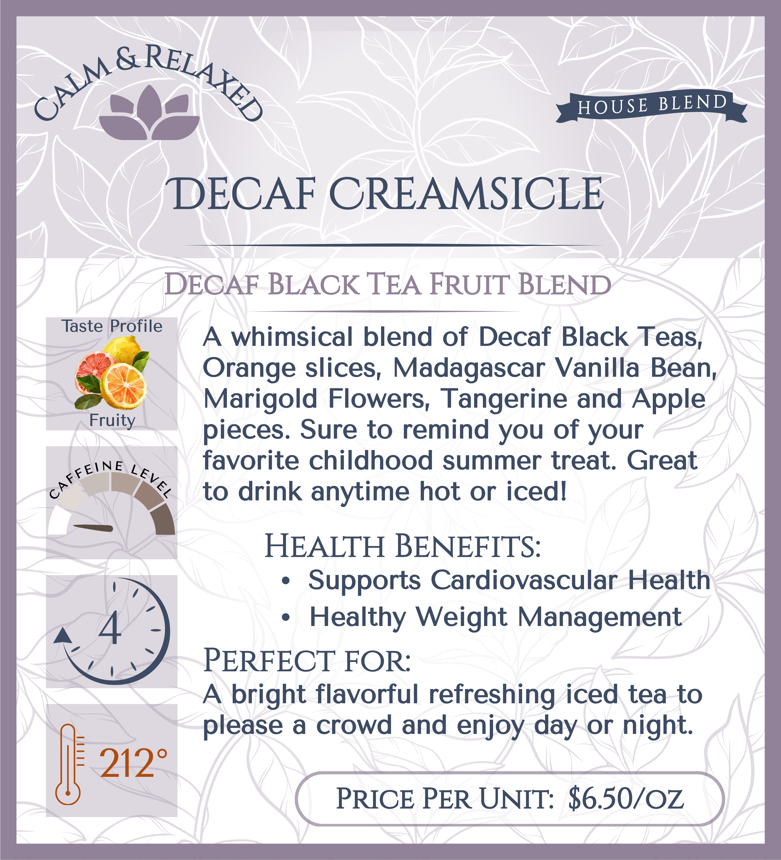 A whimsical blend of Decaf Black Teas, Orange slices, Madagascar Vanilla Bean, Marigold Flowers, Tangerine and Apple pieces. Sure to remind you of your favorite childhood summer treat. Great to drink anytime hot or iced!