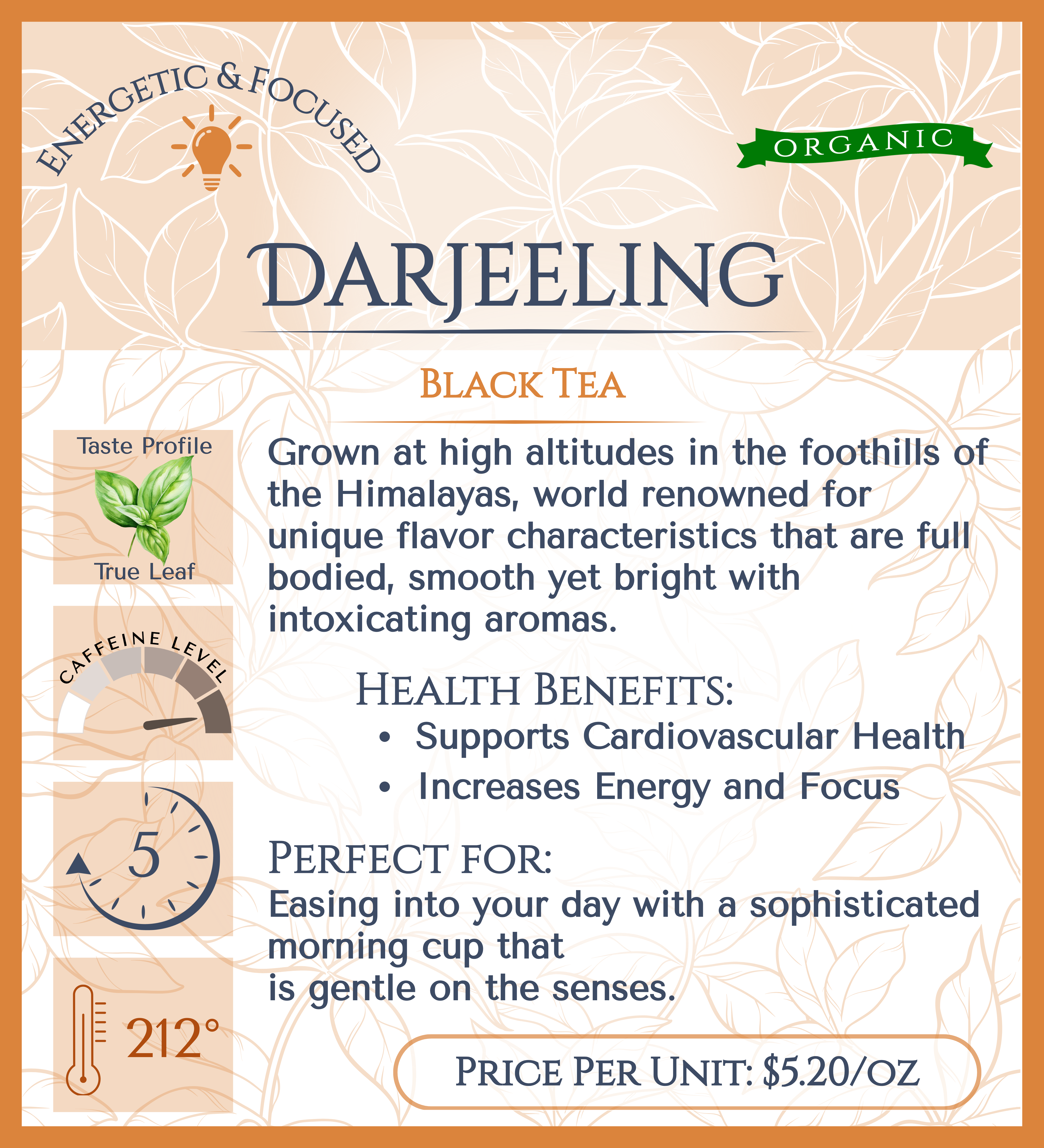 Grown at high altitudes in the foothills of the Himalayas, world renowned for unique flavor characteristics that are full bodied, smooth yet bright with intoxicating aromas.
