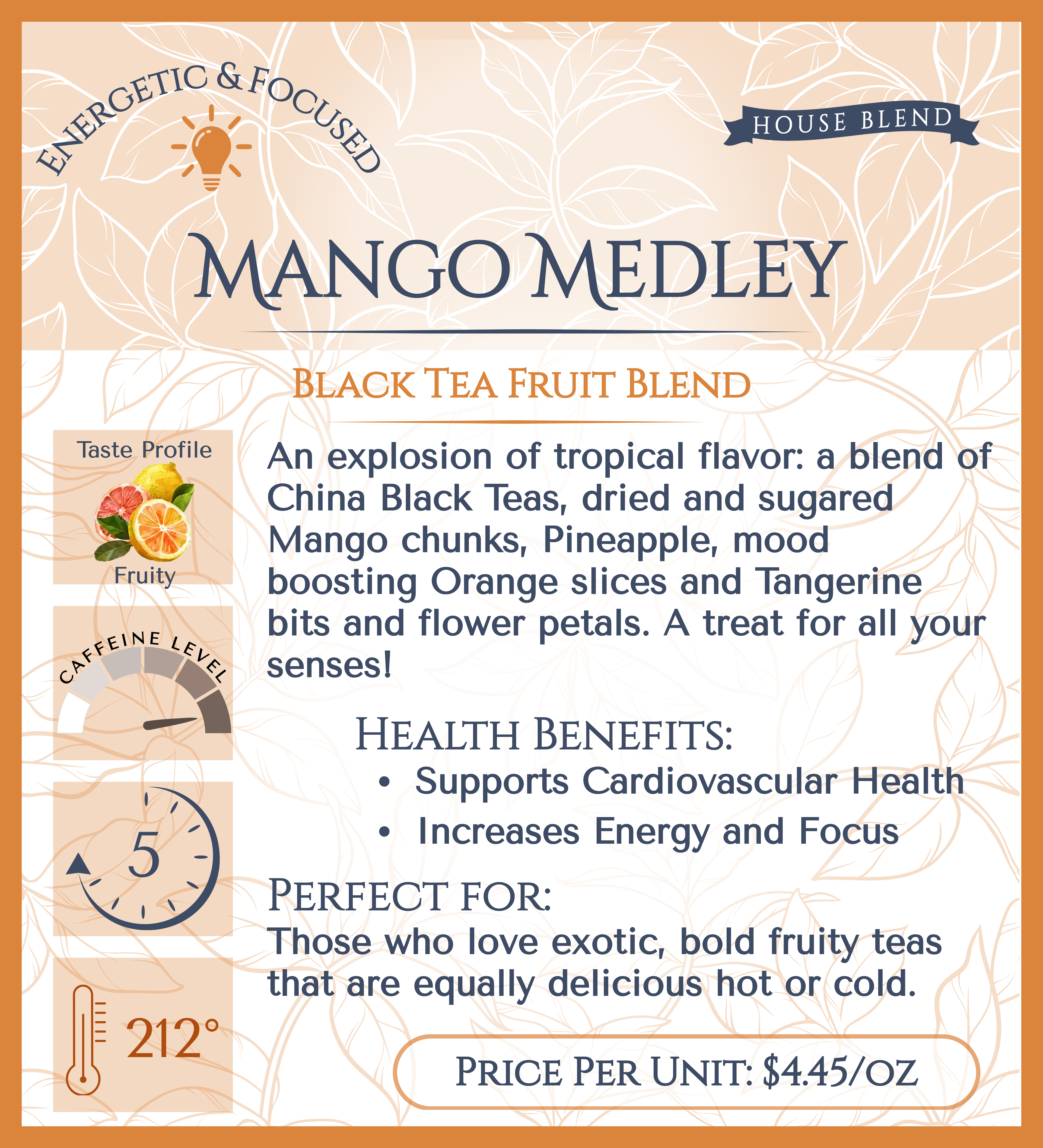 An explosion of tropical flavor: a blend of China Black Teas, dried and sugared Mango chunks, Pineapple, mood boosting Orange slices and Tangerine bits and flower petals. A treat for all your senses!