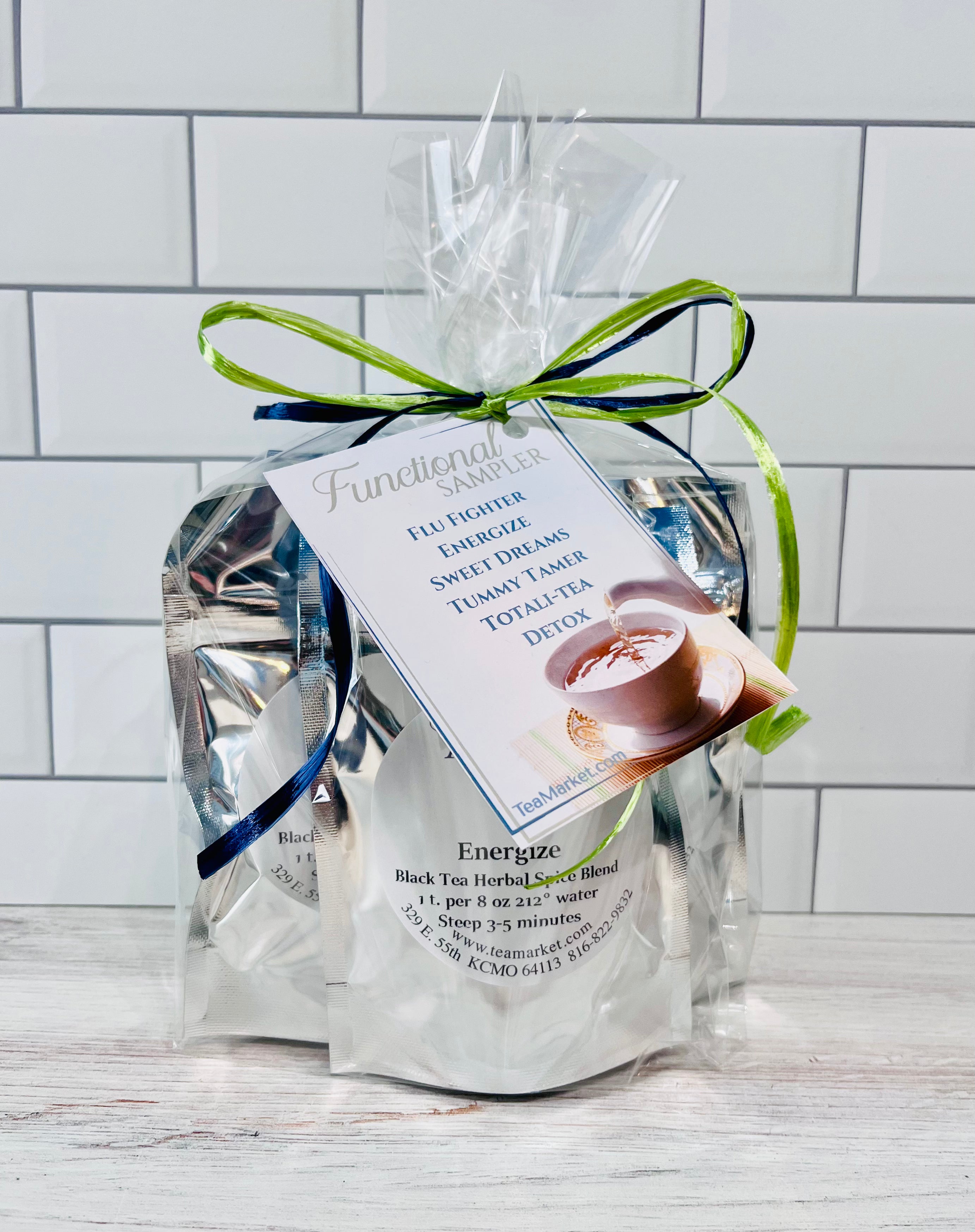 Enjoy 6 of our Functional teas (about 30 cups of tea) and an Functional Tea Information Sheet that explains the health benefits of each one and the perfect time to enjoy: