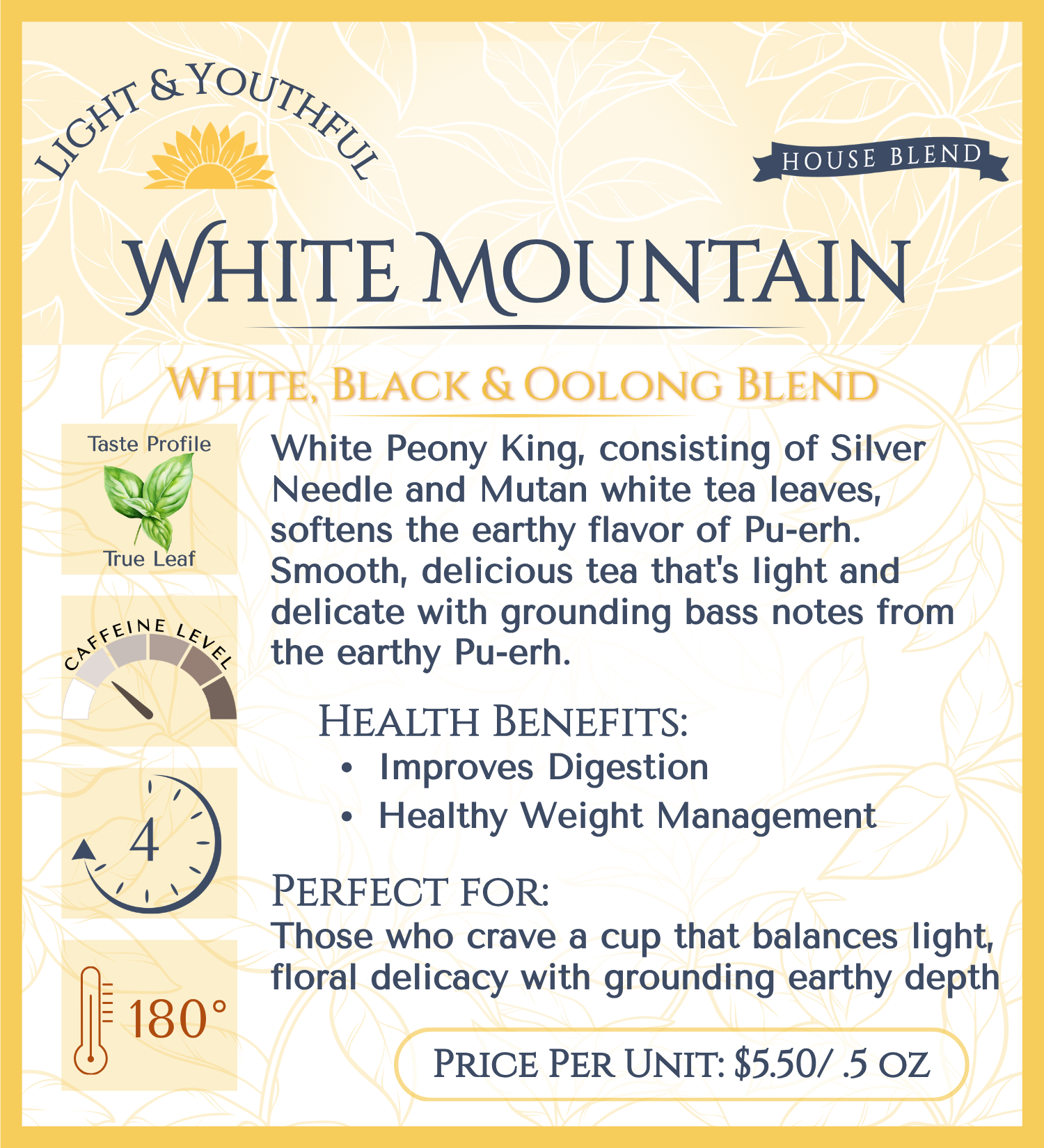 In honor of the book “The Tea Girl of Hummingbird Lane” we have blended two very traditional Chinese teas detailed in the novel. White Peony King, consisting of Silver Needle and Mutan white tea leaves, softens the earthy flavor of Pu-erh. The health benefits of both are married and result in a smooth, delicious tea that's light and delicate with grounding bass notes from the earthy Pu-erh.