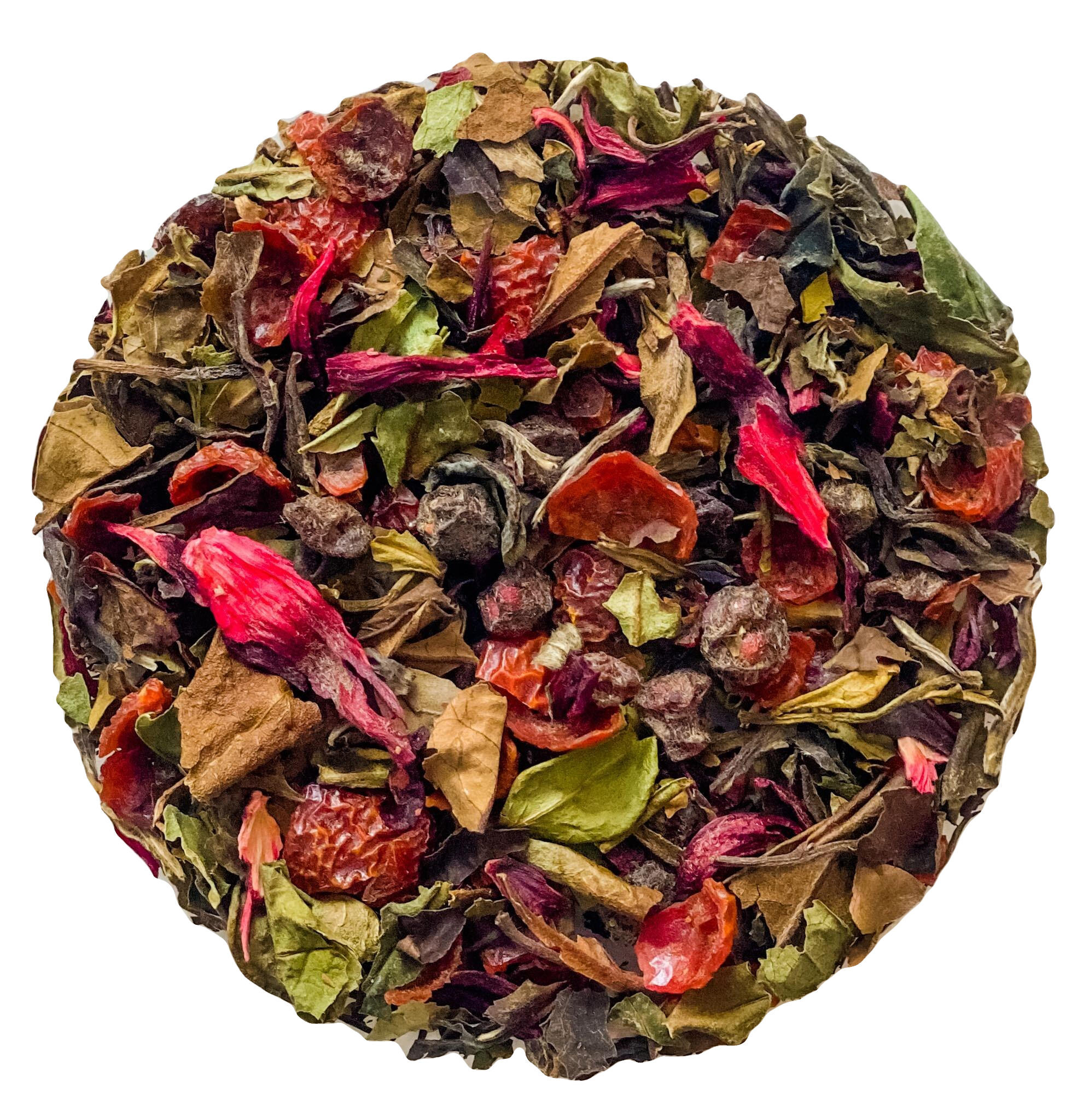 Organic white tea, organic rosehips, organic cranberries, organic hibiscus, organic currants, organic schizandra berries, organic raspberries. Organic linden flower and organic linden leaves. Natural flavors.