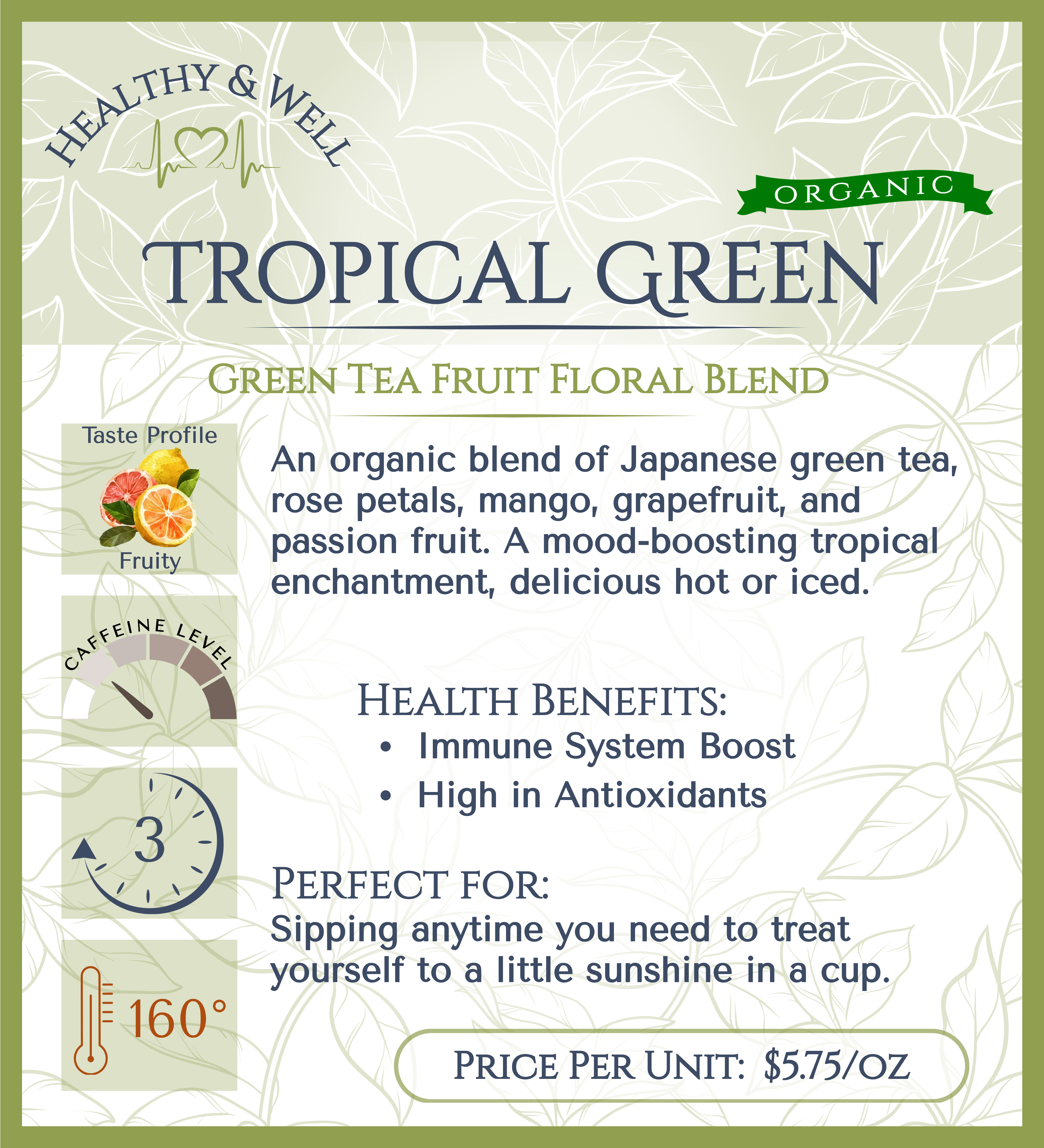 An all-organic blend of Japanese Green Tea, Rose petals, sweet Mango, tangy Grapefruit, Flowers and exotic Passion Fruit. Lovely, mood boosting Tropical enchantment you can enjoy anytime, that’s just as delicious hot as it is icy cold.