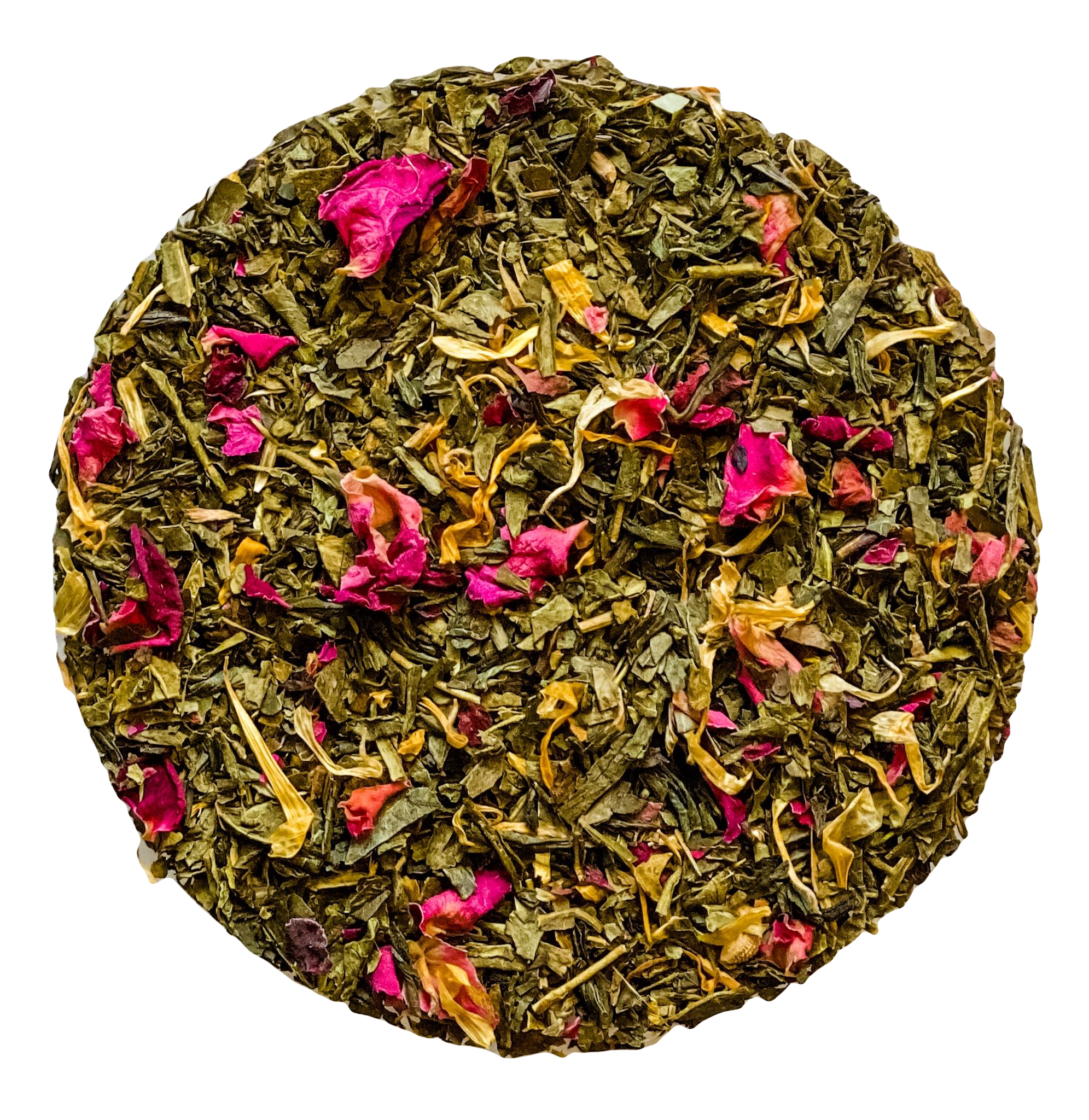 Organic Green Tea, organic rose petals, organic calendula petals, natural passionfruit, mango and grapefruit flavor