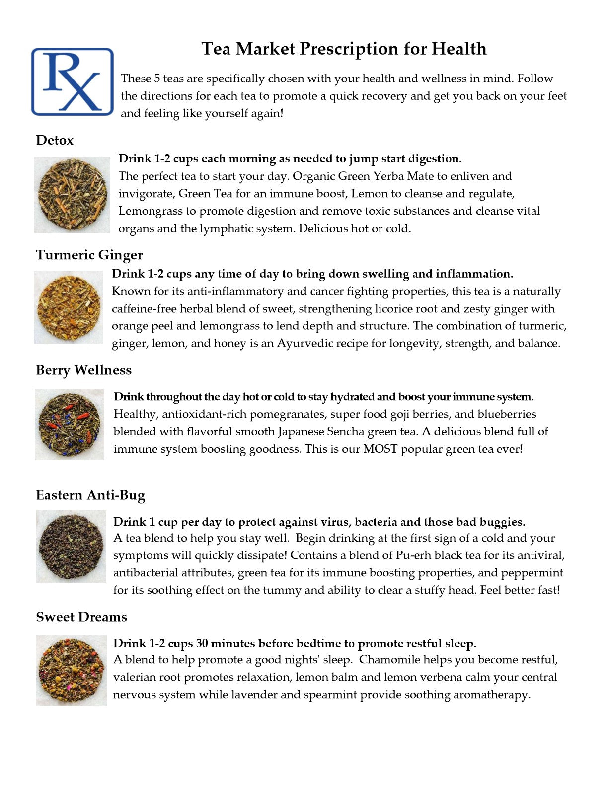 • The "Tea Market Prescription for Health" describing each tea, dosage recommendations, and health benefits.