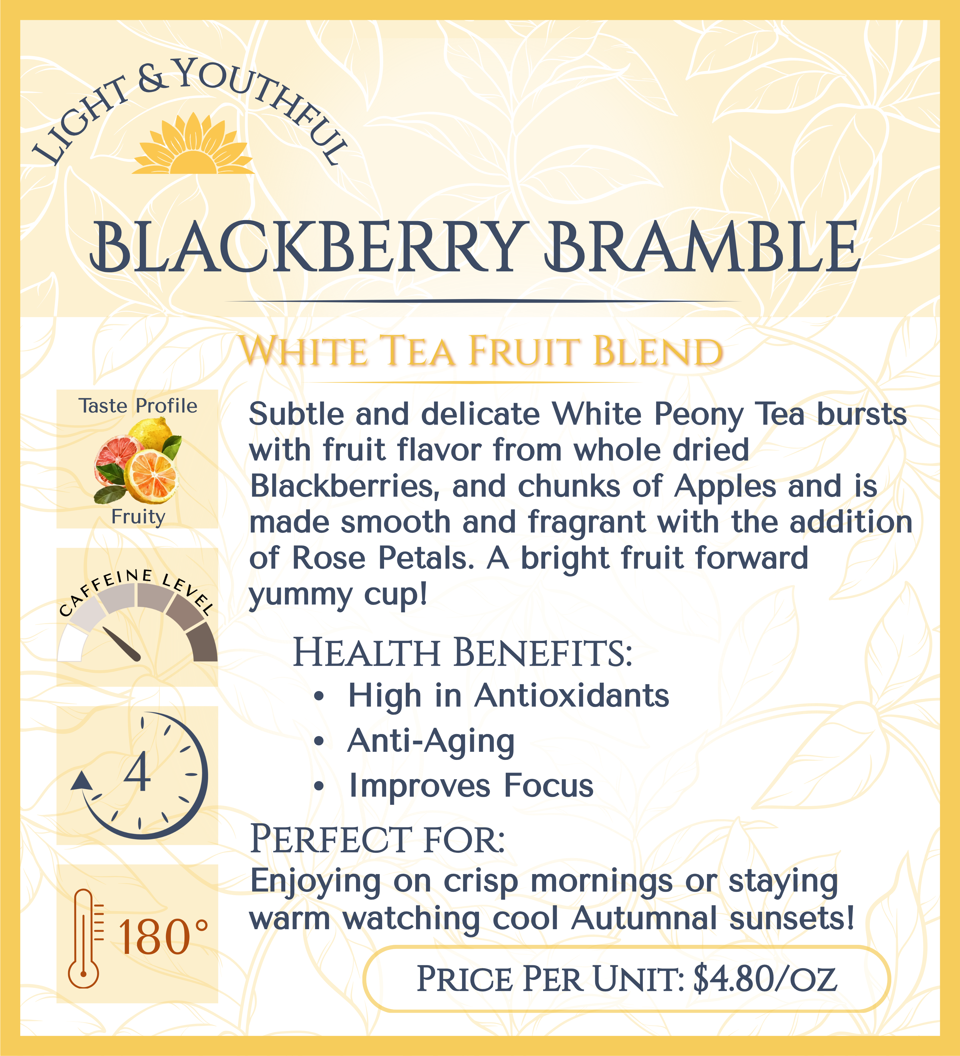 Subtle and delicate White Peony Tea bursts with fruit flavor from whole dried Blackberries, and chunks of Apples and is made smooth and fragrant with the addition of Rose Petals.  A bright fruit forward yummy cup!